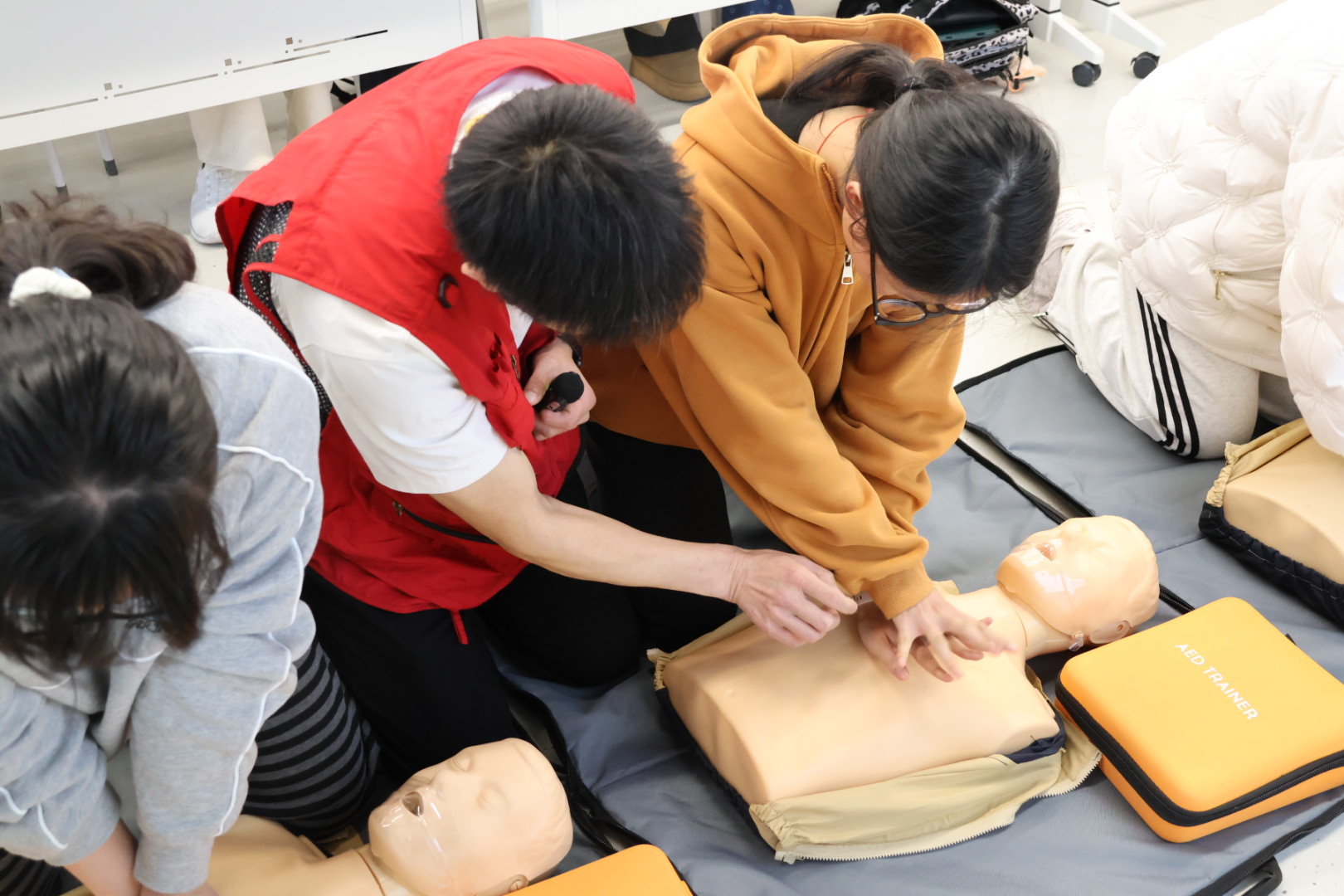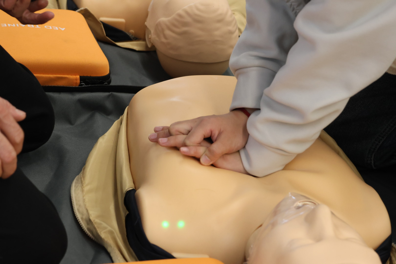 在CPR实操环节,同学们重点练习了持续胸外按压。导师反复强调“用力压、快速压、充分回弹”,按压深度成人应达到5至6厘米,频率维持在每分钟100至120次。训练过程中,多位同学通过按压反馈装置看到指示灯由红转绿,标志着按压力度与频率达到有效标准,直观体验到“有效按压”的实际感受。
