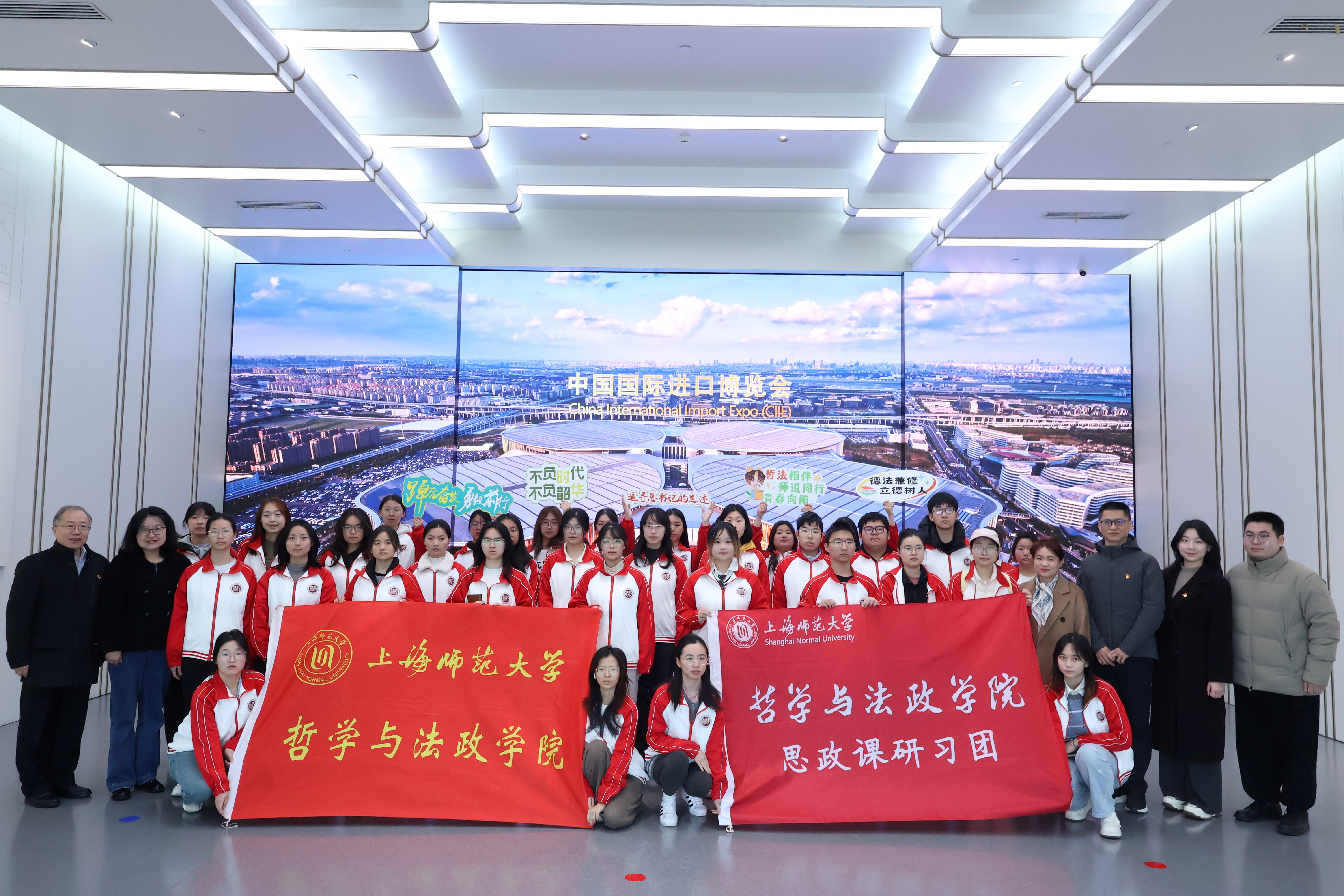 同学们在现场教学中积极互动问答,畅谈自己的理解与体会,他们的真切表达,展现了哲法学子在实景教学中思想的升华与成长。赵银亮教授指出,进博会是习近平新时代中国特色社会主义思想,特别是习近平外交思想的生动实践和完美诠释,进博会的成功举办,向世界展示了中国式现代化的开放图景,也彰显了“海纳百川”的大国气度。